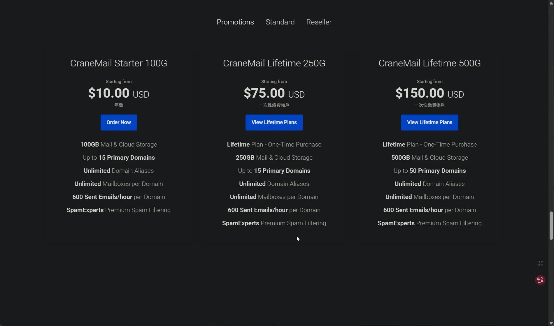 - 10 USD/yr 100G 邮件存储空间,15 个主域名(无限的域名别名)无限的收件账号,病毒扫描,每个域每小时发送 600 封邮件